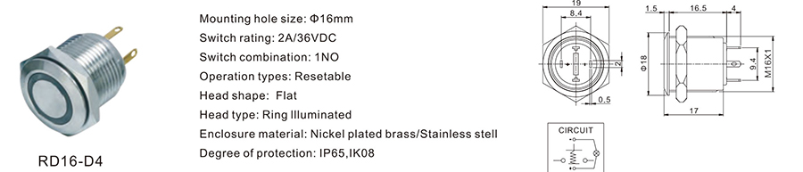 金屬開關(guān) | RD16-D4 | 36VDC | 2A | / | / | ≥100,000 CYCLES | 立即申請 | 下載 |