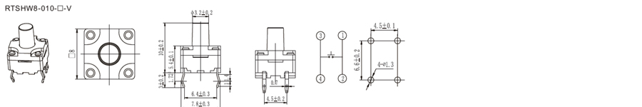8x8mm輕觸開關(guān) | RTSHW8 | 12VDC | 50mA | 2+1gf | 0.5±0.3mm | 1,000,000 cycles | 立即申請 | 下載 |