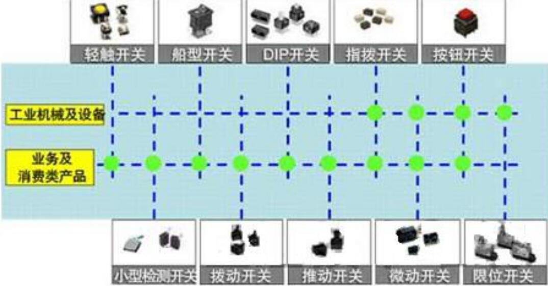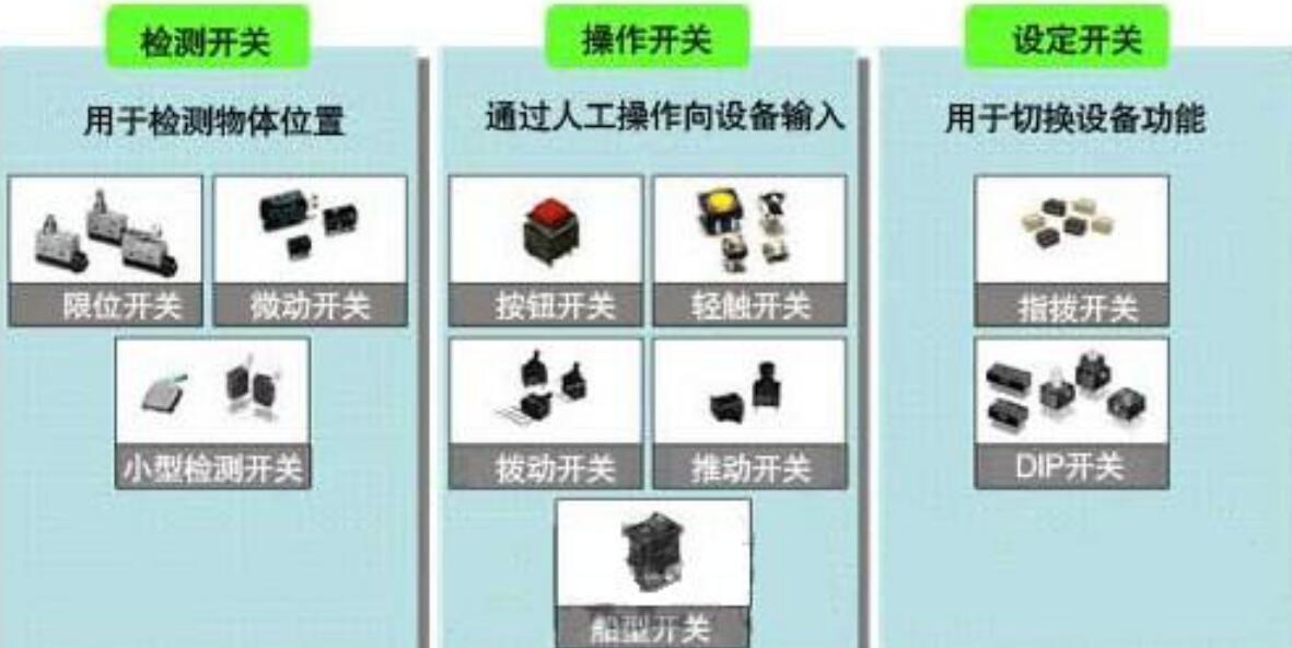 開關(guān)根據(jù)配備對象和目的的不同分為很多種類。從配備對象來看,大規(guī)模工業(yè)機械和設(shè)備使用的開關(guān)是限位開關(guān)和按鈕開關(guān)。這類開關(guān)的特點是,尺寸大、具有牢固的構(gòu)造、。而微動開關(guān)、小型檢測開關(guān)、輕觸開關(guān)、撥動開關(guān)、推動開關(guān)、船型開關(guān)、指撥開關(guān)以及DIP開關(guān)則用于中小規(guī)模的業(yè)務(wù)產(chǎn)品和消費類產(chǎn)品,利用其小型和薄型的特點為產(chǎn)品的小型化、薄型化和輕量化做出了貢獻。