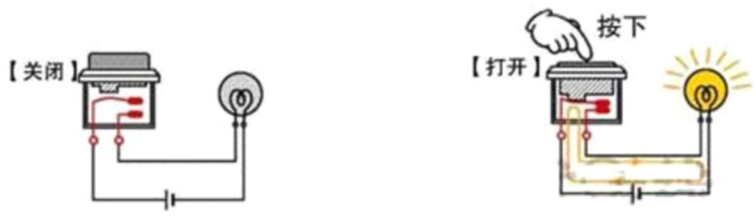 a型觸點開關是指,沒有按下開關時候,兩個接觸點處于斷開狀態(tài),按下后變成導通狀態(tài)。想通過操作開關運轉負荷(電燈或馬達等通過與電路連接消耗電氣能源的設備)時,使用a型觸點開關。下面介紹的電路就使用了a型觸點開關,沒有按下開關時,燈是關著的,按下開關時燈被點亮(圖1)。