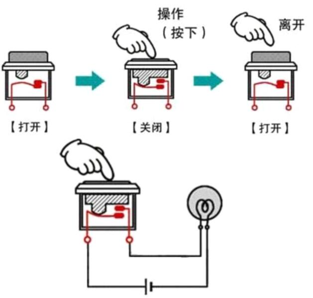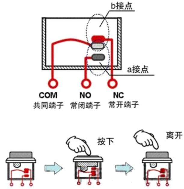 與a型觸點開關相反,按下開關時變成斷開狀態(tài)。