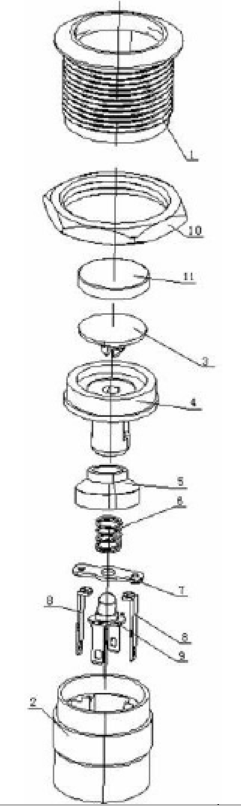 防水金屬按鈕開關(guān),包括外殼和連接于外殼底部的基座,外殼和基座的內(nèi)部沿從上到下的方向依次安裝有按鍵、導(dǎo)光圈、防水圈、彈簧、接觸片和LED燈組件,按鍵安裝于導(dǎo)光圈的頂部,防水圈套裝于導(dǎo)光圈的外部,所述的LED燈組件包括支架、設(shè)置于支架上部的燈罩和設(shè)置于燈罩內(nèi)的多個LED光源,LED光源的接線柱設(shè)置于支架上,LED光源的接線柱貫穿基座,接觸片上安裝有兩個銀點,基座上安裝有兩個與兩個銀點相配合的端子。外殼的外表面設(shè)置有螺紋,外殼的外部套裝有螺母。按鍵的頂部套裝有按鍵帽子。