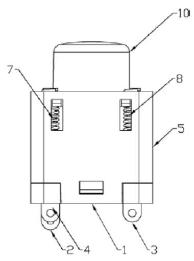 按鈕帶燈開(kāi)關(guān)自鎖復(fù)位采用了彈簧導(dǎo)電的設(shè)計(jì),包括底座、第一接線端子、第二接線端子、第三接線端子、殼體、自鎖復(fù)位開(kāi)關(guān)、第一復(fù)位彈簧、第二復(fù)位彈簧、發(fā)光組件和按鈕;發(fā)光組件固定設(shè)置在按鈕的下方,按鈕的外側(cè)與殼體的內(nèi)腔滑動(dòng)連接,第一復(fù)位彈簧和第二復(fù)位彈簧均位于底座和按鈕之間,第一復(fù)位彈簧的上端與發(fā)光組件的第一電極電連接,第一復(fù)位彈簧的下端與第一接線端子電連接,第二復(fù)位彈簧的上端與發(fā)光組件的第二電極電連接,第二復(fù)位彈簧的下端與第三接線端子電連接;第一接線端子、第二接線端子、第三接線端子均設(shè)置在底座上;自鎖復(fù)位開(kāi)關(guān)設(shè)置在殼體內(nèi)且位于按鈕的下方,自鎖復(fù)位開(kāi)關(guān)包括自鎖復(fù)位結(jié)構(gòu)和冷動(dòng)板,自鎖復(fù)位開(kāi)關(guān)的通斷通過(guò)按鈕推動(dòng)實(shí)現(xiàn);當(dāng)自鎖復(fù)位開(kāi)關(guān)處于通狀態(tài)時(shí),冷動(dòng)板位于最低處,第一接線端子和第二接線端子通過(guò)冷動(dòng)板電連接;當(dāng)自鎖復(fù)位開(kāi)關(guān)處于斷狀態(tài)時(shí),冷動(dòng)板位于最高處,第一接線端子和第二接線端子斷開(kāi)電連接。所以,本發(fā)明只需要三個(gè)接線端子數(shù)量,相對(duì)于現(xiàn)有技術(shù)中的開(kāi)關(guān)來(lái)說(shuō),本發(fā)明的接線端子數(shù)量更加少,結(jié)構(gòu)緊湊,而且具有良好的穩(wěn)定性。