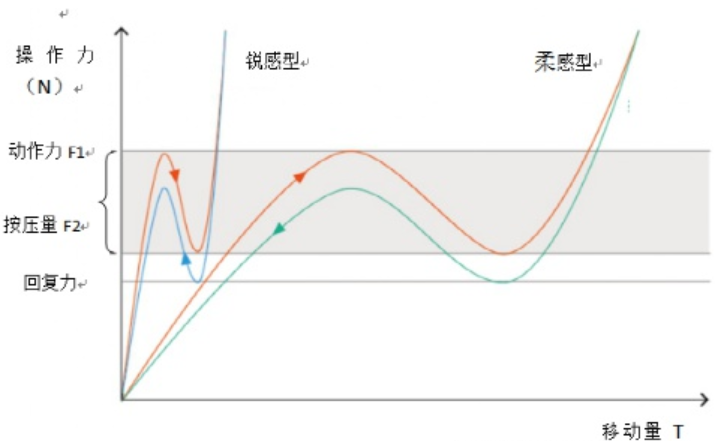 在同一操作力情況下,行程長時觸感柔軟順滑,行程短時觸感敏銳迅捷。即使是同一行程,按壓率發(fā)生變化時手指感受到的觸感也會發(fā)生變化(普遍認為40%~60%為佳)。